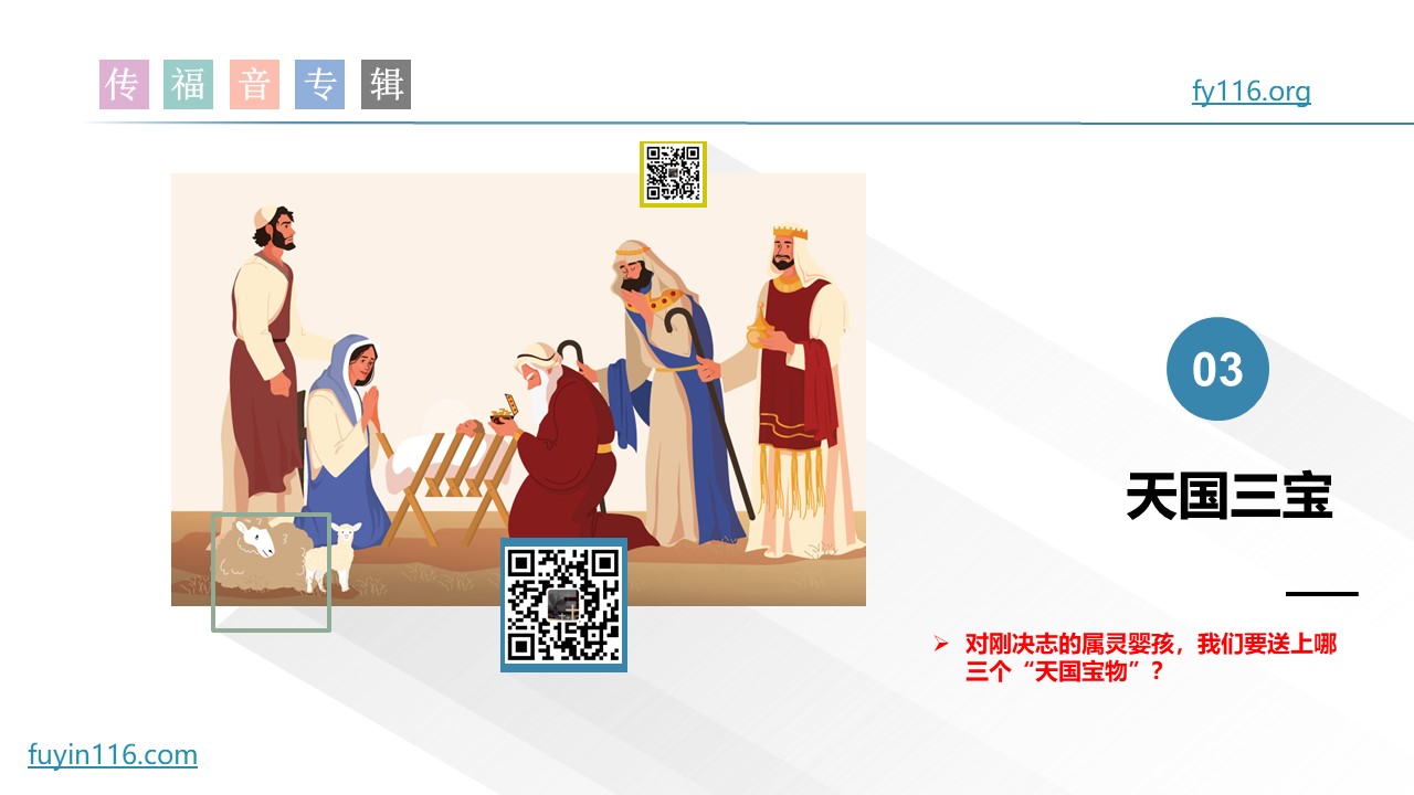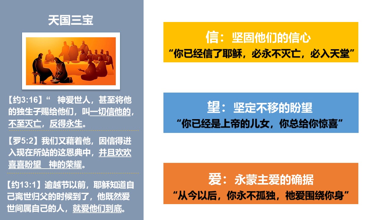 对刚决志的属灵婴孩,我们要送上哪三个“天国宝物”?