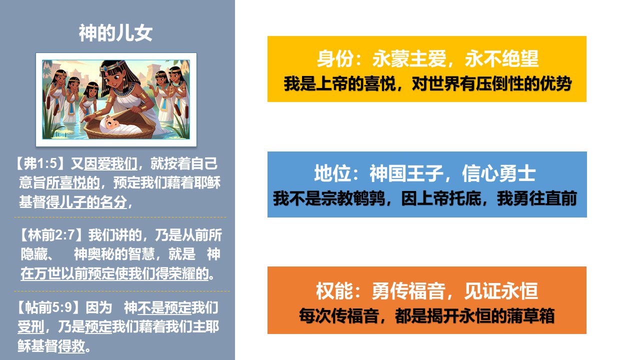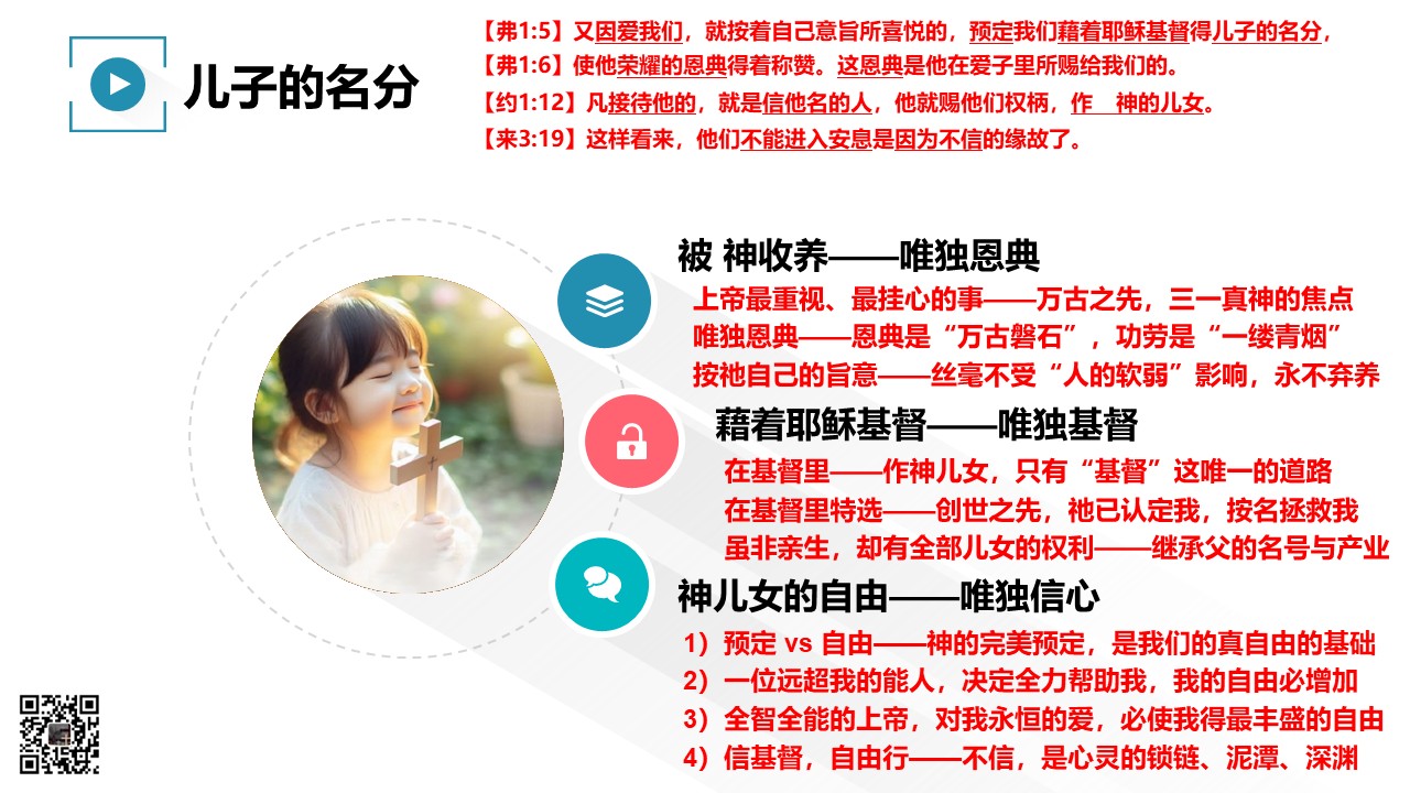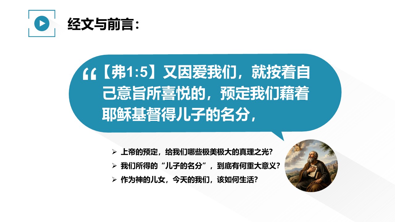 《以弗所书》一开篇,圣徒保罗就讲到“上帝预定我们,得儿子的名分”这个荣耀的真理。